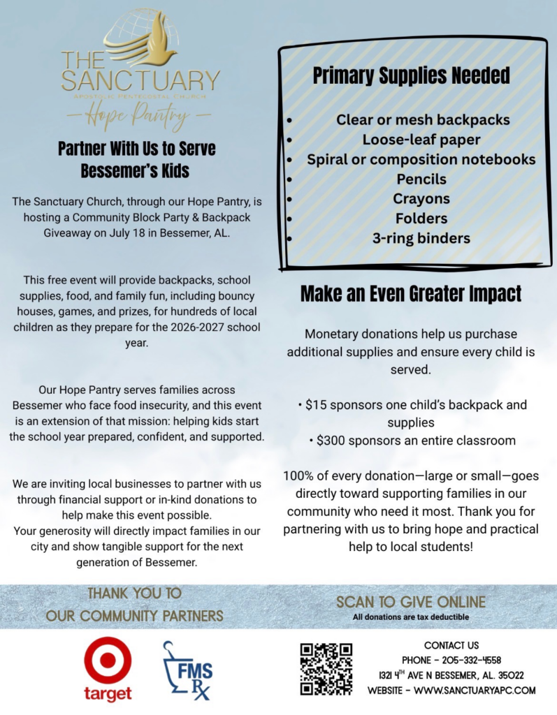 The Sanctuary Church, through our Hope Pantry, is throwing a Community Block Party & Backpack Giveaway on July 18 in Bessemer!